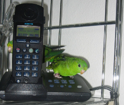 Februar 2007: Wie alle kleinen federlosen Jungs sind auch unsere verrückten grünen Jungs technisch interessiert. Fernsteuerungen, Taschenrechner und auch das Telefon ziehen sie magisch an und müssen "untersucht" werden.