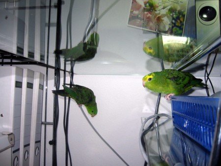 30. Oktober 2007 Moritz und Sammy fliegen mich an, als ich sie füttern möchte. beide landen zuerst auf den Futternäpfen, dann auf den Wassernäpfen... es ist einfach toll! Aber das i-Tüpfelchen ist, dass Moritz, als alle Näpfe schon wieder ge-füllt in der Villa hingen, nochmal auf meinen Arm geflogen ist, obwohl es gar nichts mehr zu "holen" gab.